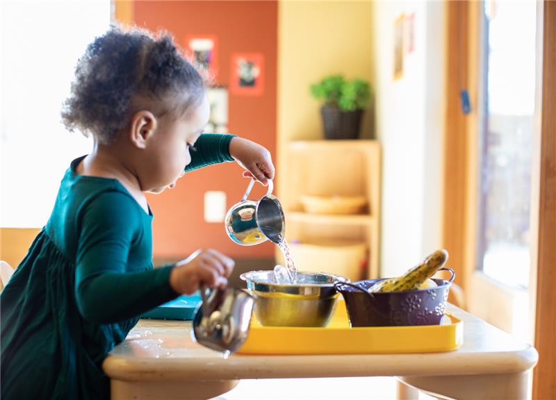 Montessori classrooms offer child sized materials and clear routines that allow children to practice everyday skills independently, with teachers offering guidance as needed.